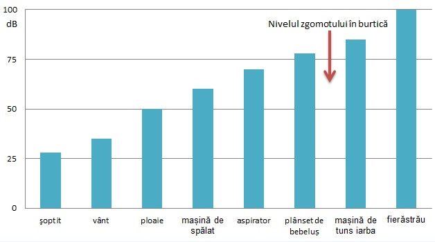 Studiile au arătat că nivelul zgomotului în interiorul uterului este undeva între 72-88dB. Ca să îți dai seama ce înseamnă, concret, aruncă o privire pe graficul de mai jos: