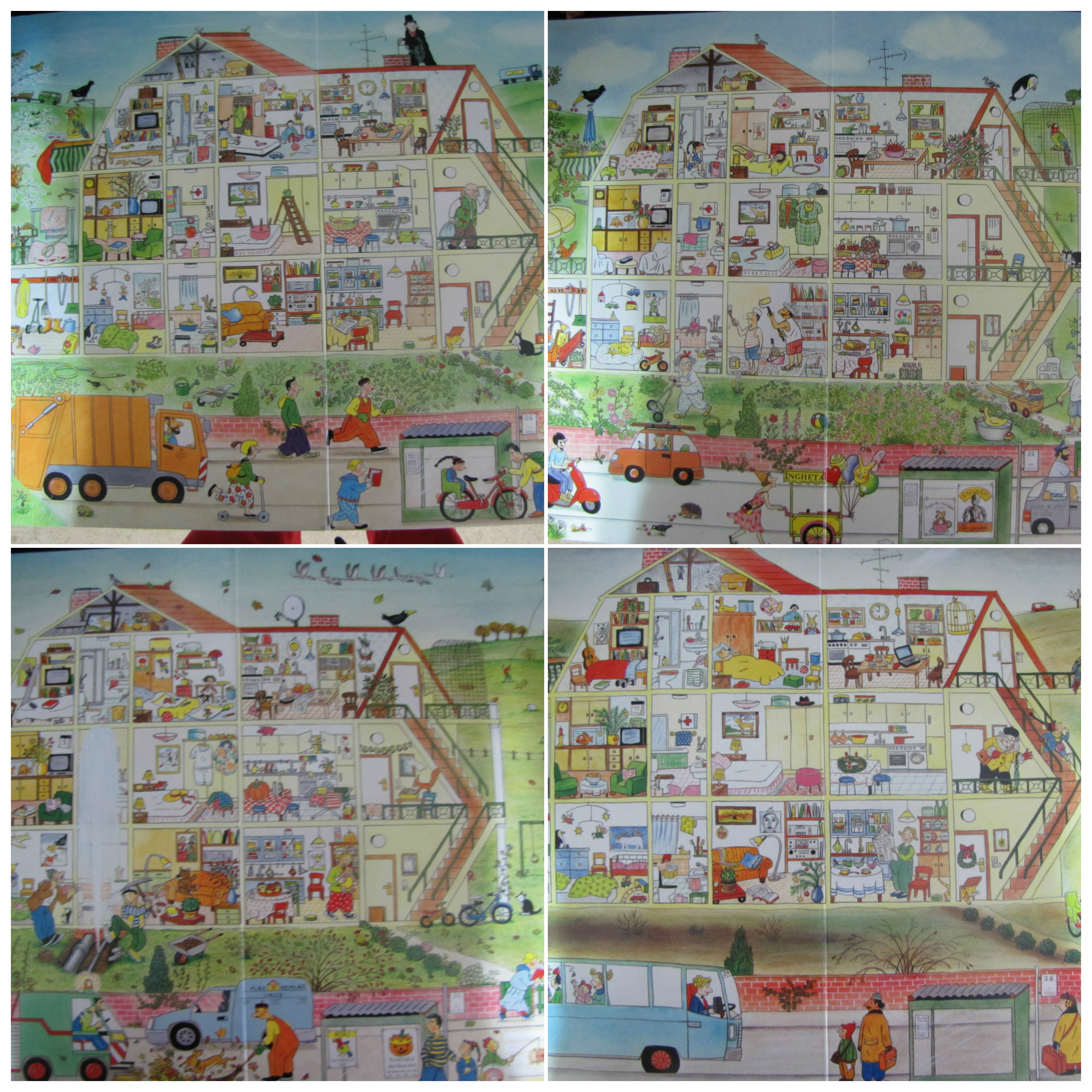 Ceea ce mi se pare admirabil la aceste cărți e faptul că găsești în ele absolut orice: bebeluși alăptați, bebeluși purtați, măicuțe, țevi care se sparg, curcubeu, frizerie, gradiniță, moș crăciun pe motocicletă, baloane, oameni în scaun cu rotile, pană de bicicletă, și multe multe altele. Paginile sunt extrem de bogate în detalii, atât de bogate încât chiar dacă am răsfoit cărțile de zeci de ori, de fiecare dată mai descopăr ceva nou.