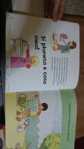 O carticica ieftina, doar 9 lei a costat, dar cu mesaje scumpe. Sa protejam natura, sa reciclam sticle, sa avem grija nu numai de lucruri, dar si de corpul si de sanatatea noastra. Nu e prea complicata pentru un copil de 2 ani, indraznesc sa spun. E o varsta perfecta pentru a-i explica de ce fetita din poze arunca hartiile la cosul de gunoi, sau de ce nu lasa apa sa curga. Nu o sa para ca intelege, dar se vor vedea efectele povestilor, in timp.