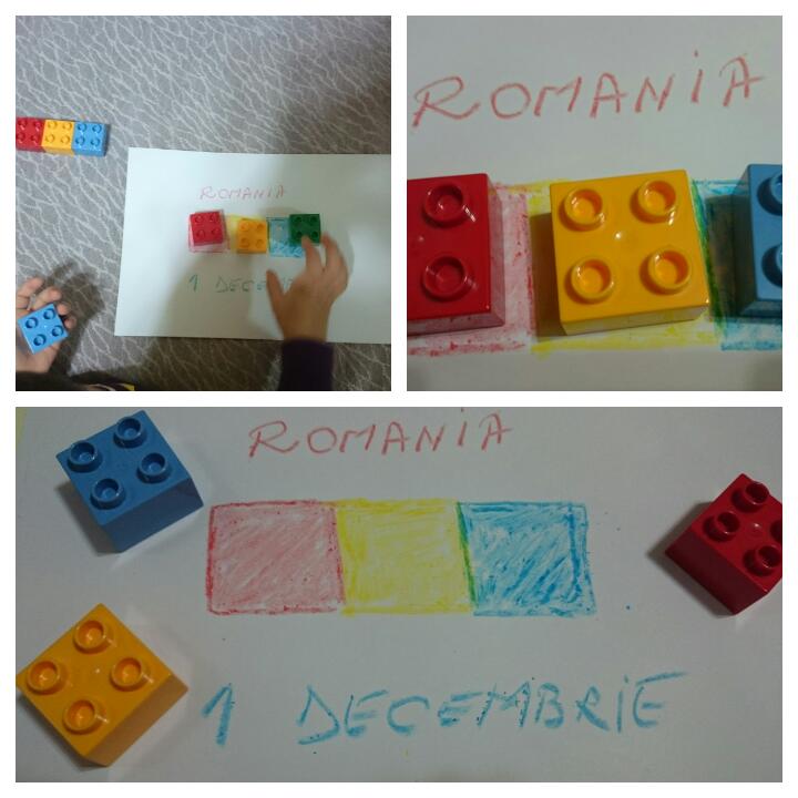 Materiale necesare: o foaie, creioane colorate, si 3 obiecte patrate in culorile tricolorului. Eu am folosit lego, pana la urma mergeau si 3 bucatele de foaie colorate si apoi decupate.