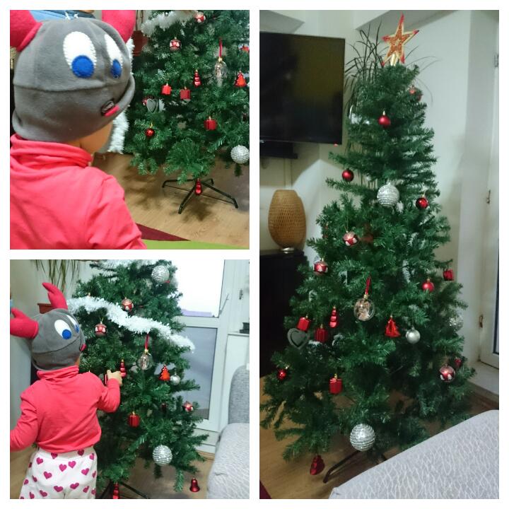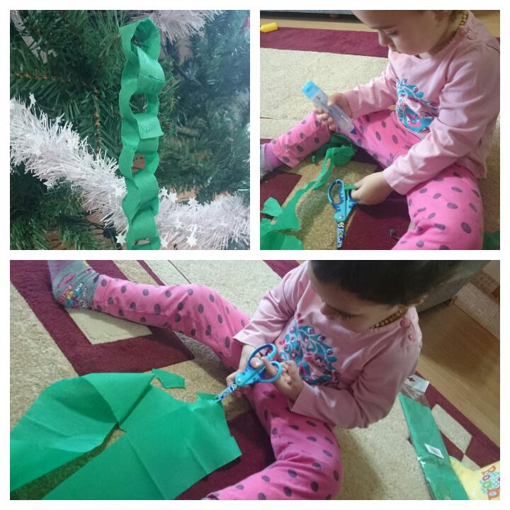 Materiale necesare: hartie creponata (eu aveam doar verde), foarfeca pentru copii si lipici. Copilul taie hartia cum poate, adultul o repara si face ornamentul, copilul il agata in brad apoi e fericit ca el a realizat totul 🙂