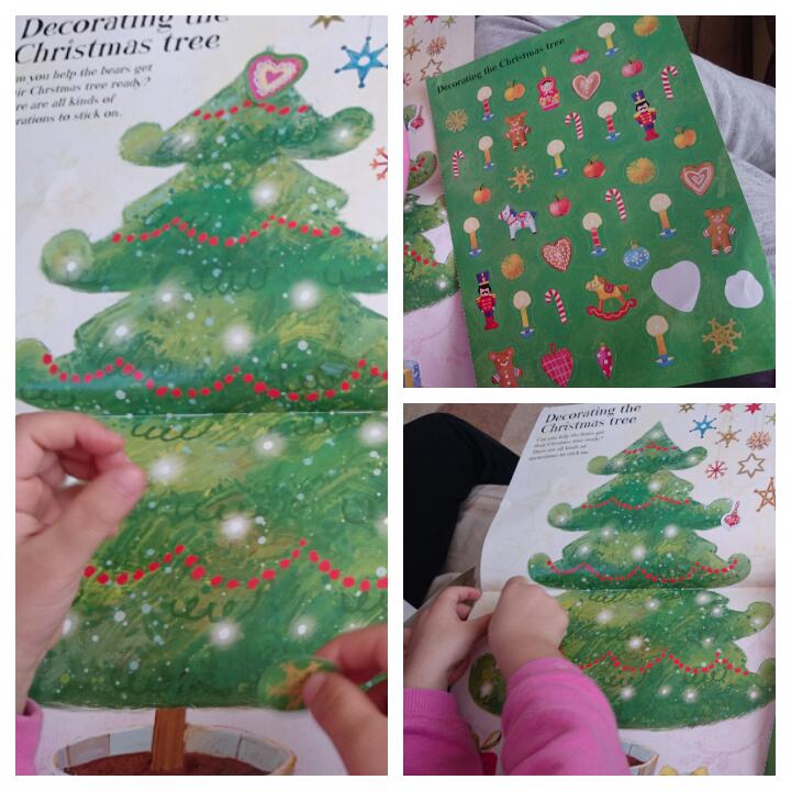 Materiale necesare: sunt pline librariile de carti de genul, eu am optat pentru una de la Usborne, Dress the Teddy Bears for Christmas. Mare succes, recomand.