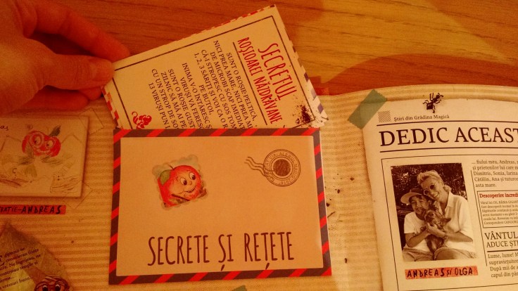 Am făcut câteva poze pe care le voi lăsa să vorbească de la sine, căci sunt foarte colorate, frumoase, cu desene reușite. Mesajul cărții e foarte educativ si, dincolo de povestea amuzantă, întărește importanța unei diete bogate în legume si fructe pentru a avea un sistem imunitar mereu pregătit să țină piept virușilor. Mi-a plăcut foarte mult și plicul cu rețete atașat pe coperta interioara – mici poezioare despre morcovi, ceapa sau usturoi.