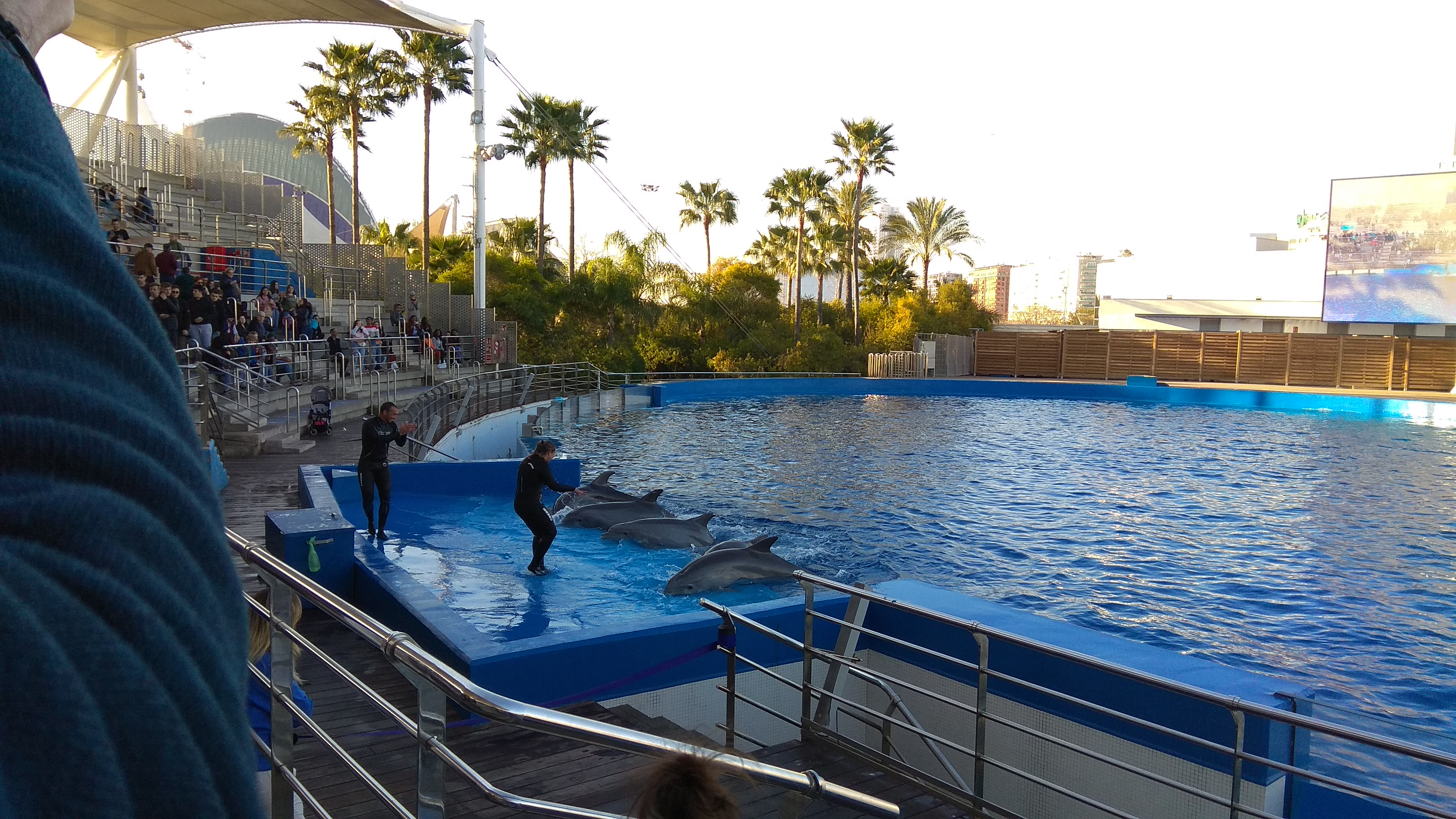 Pe indicatoare se recomanda să ajungi la locul faptei cu circa 30 de minute înainte, iar noi ne-am conformat. Și a fost bine, pentru că am prins ceva și din antrenamentele delfinilor, apoi s-au proiectat și câteva filmulețe scurte despre viața acvatică, despre activitatea ecologică a fundației sponsorizate de Oceanografic și despre pasiunea oamenilor care lucrează acolo.