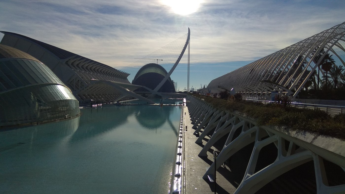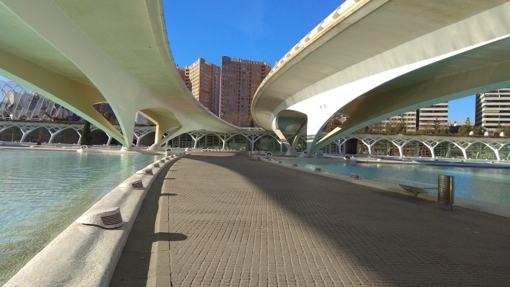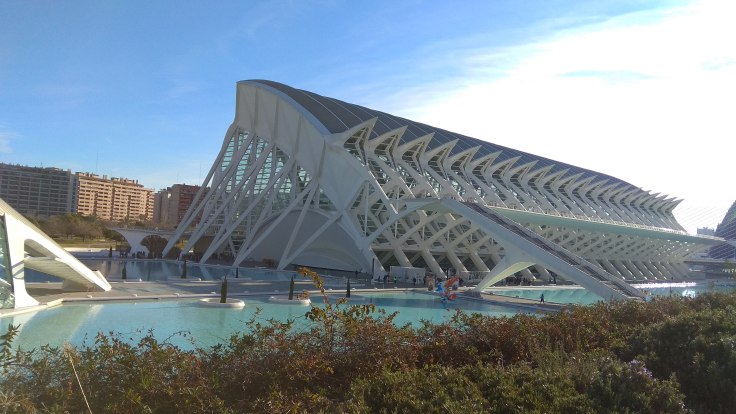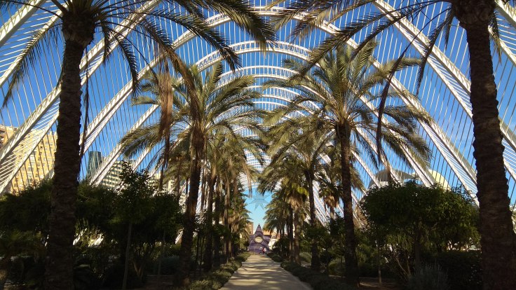 Cu această imagine în minte, am pornit de la hotel din nou spre zona nouă a Valenciei. Am lăsat mașina tot undeva pe un bulevard principal, în apropierea Oceanograficului. N-am avut de plătit parcare nici de data asta, yey. Și am luat-o la pas spre obiectivul nostru. Drumul până acolo se anunța și el spectaculos, pentru că trecea prin zona numită Orașul Artelor și Științelor . Am trecut întâi prin l’ Umbracle, un pasaj interesant , cu palmieri și linii metalice îndrăznețe. După ce am ieșit din el, am admirat arhitectura cu totul deosebită a muzeului de științe și a palatului Muzicii, două clădiri cu design futurist aflate una lângă alta. O să las pozele să vorbească, cred că nu mai e nimic de adăugat.