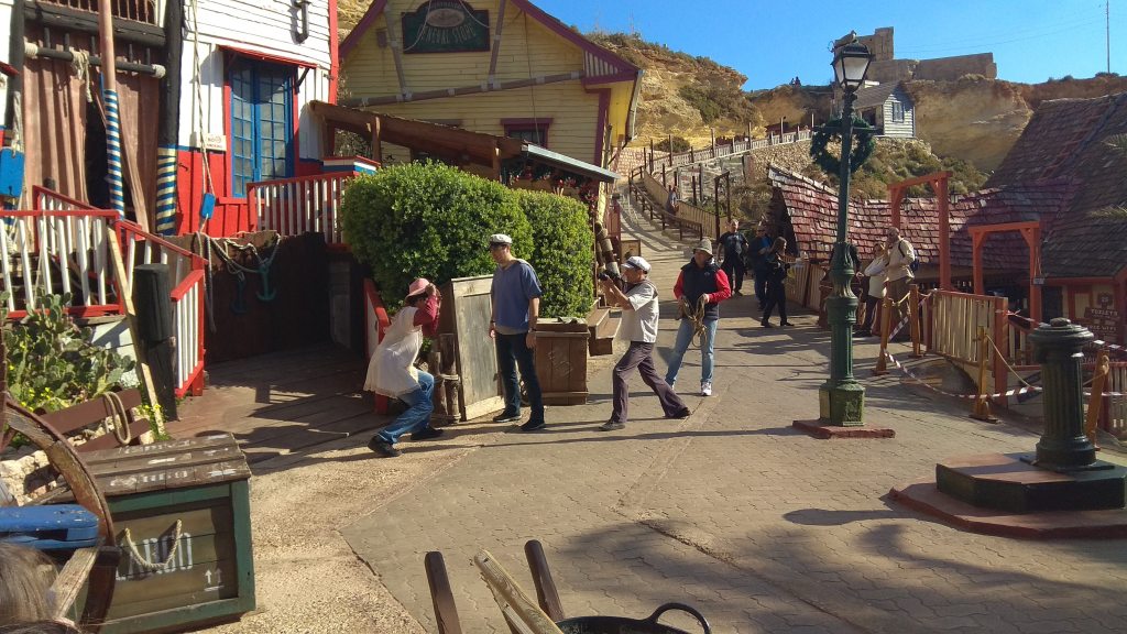 De 2 ori pe zi, la 11 și 14:30, are loc câte o filmare, în regia lui Popeye. Se adună turiștii în piața satului, se explică acțiunea, sunt aleși actorii (mai mult pe bază de voluntariat), se împart costumele, apoi se trece la filmarea propriu-zisă. Totul durează 30 de minute, rezultatul final e un scurt metraj cam de 7 minute pe care îl puteți vedea chiar într-o sală de cinema, imediat, cu popcorn în brațe și cu ochii în lacrimi. De râs, nu de altceva. Mai mult, puteți primi filmul pe mail (5 euro) și garantez că e genul de amintire unică pe care chiar merită să dai acești bani. Noi am jucat toți 3 în filmul de la 11 și ne-am distrat maxim. Ba chiar ne-a plăcut atât de mult încât am stat și la filmul de la 14.30, de data aceasta ca spectatori, pentru a ne distra și pe seama altora.