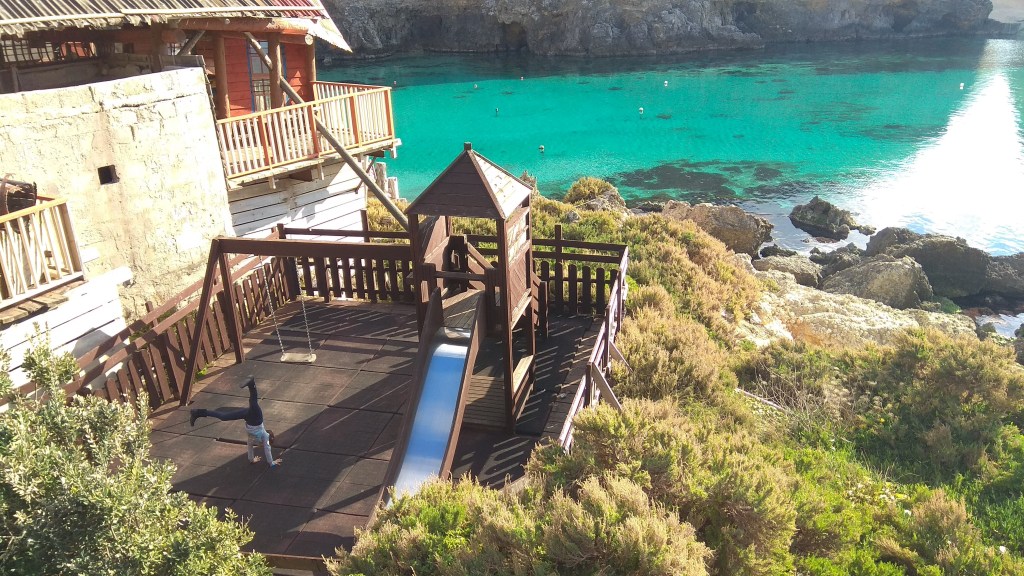 Pentru că se află în partea de nord a insulei, am ajuns aici de dimineață cu gândul de a sta 2-3 ore și de a traversa apoi cu ferry-ul spre Gozo – una dintre celelalte 2 insule malteze care pot fi vizitate. Numai că am prins o vreme atât de frumoasă și ne-a plăcut atât de mult în Popeye Village… încât aici ne-a prins și apusul soarelui.