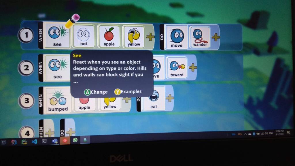 Termenul de programare la vârsta de 7 ani se traduce mai degrabă prin crearea unor conexiuni logice de tip cauză-efect. În termeni de specialitate, copiii înțeleg cam ce înseamnă instrucțiunea IF, pe care o regăsim în Kodu drept o pereche de tip WHEN … THEN…