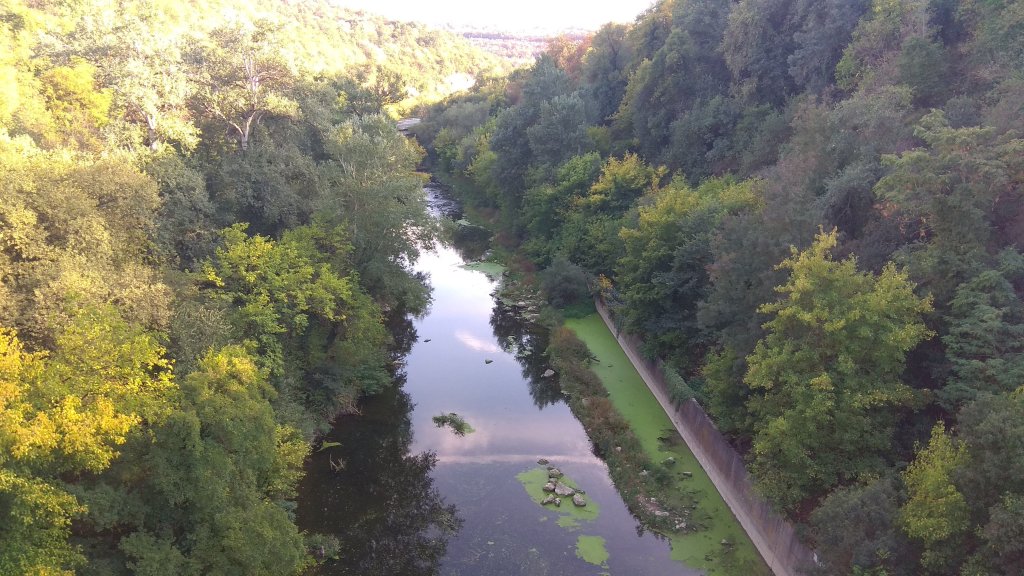 Priveliștea de pe pod e una pe care îți vine greu să crezi că o găsești chiar într-un oraș. Extrem de mult verde, înălțimi și apă.