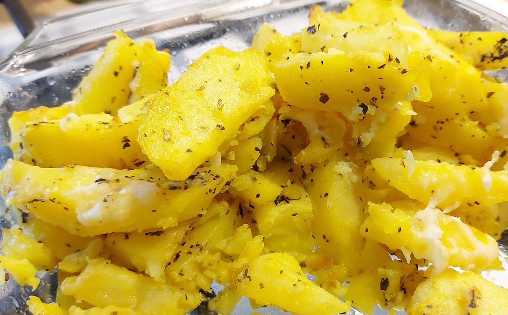 O rețetă foarte simplă: se fierb cartofii taiați mare, dar nu cât să se facă praf, apoi se pun într-un vas de yena, se amestecă cu usturoi ras, ulei de măsline, ierburi aromatice, parmezan sau cașcaval și se mai bagă puțin la cuptor. Alături merge excelent o salată de varză albă, și obținem astfel un prânz gustos și fără sățios, chiar și fără carne.