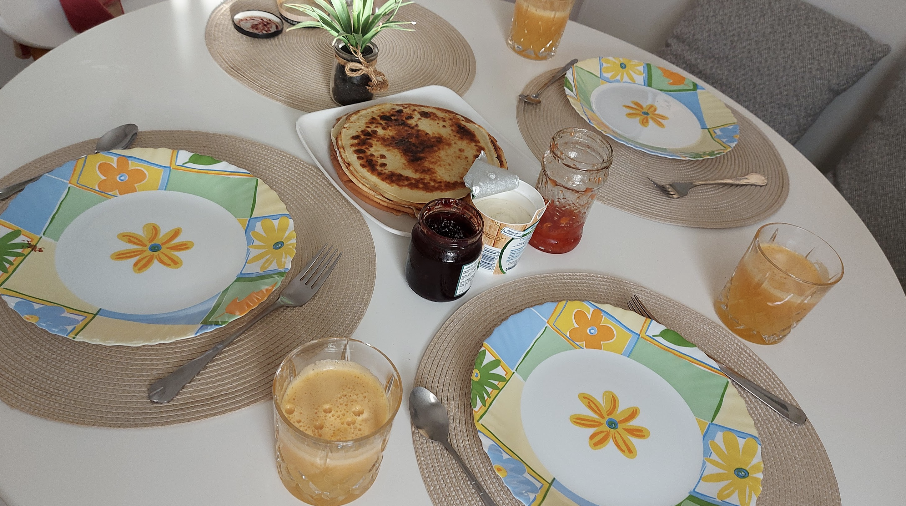 Clătite cu gem și suc de portocale
