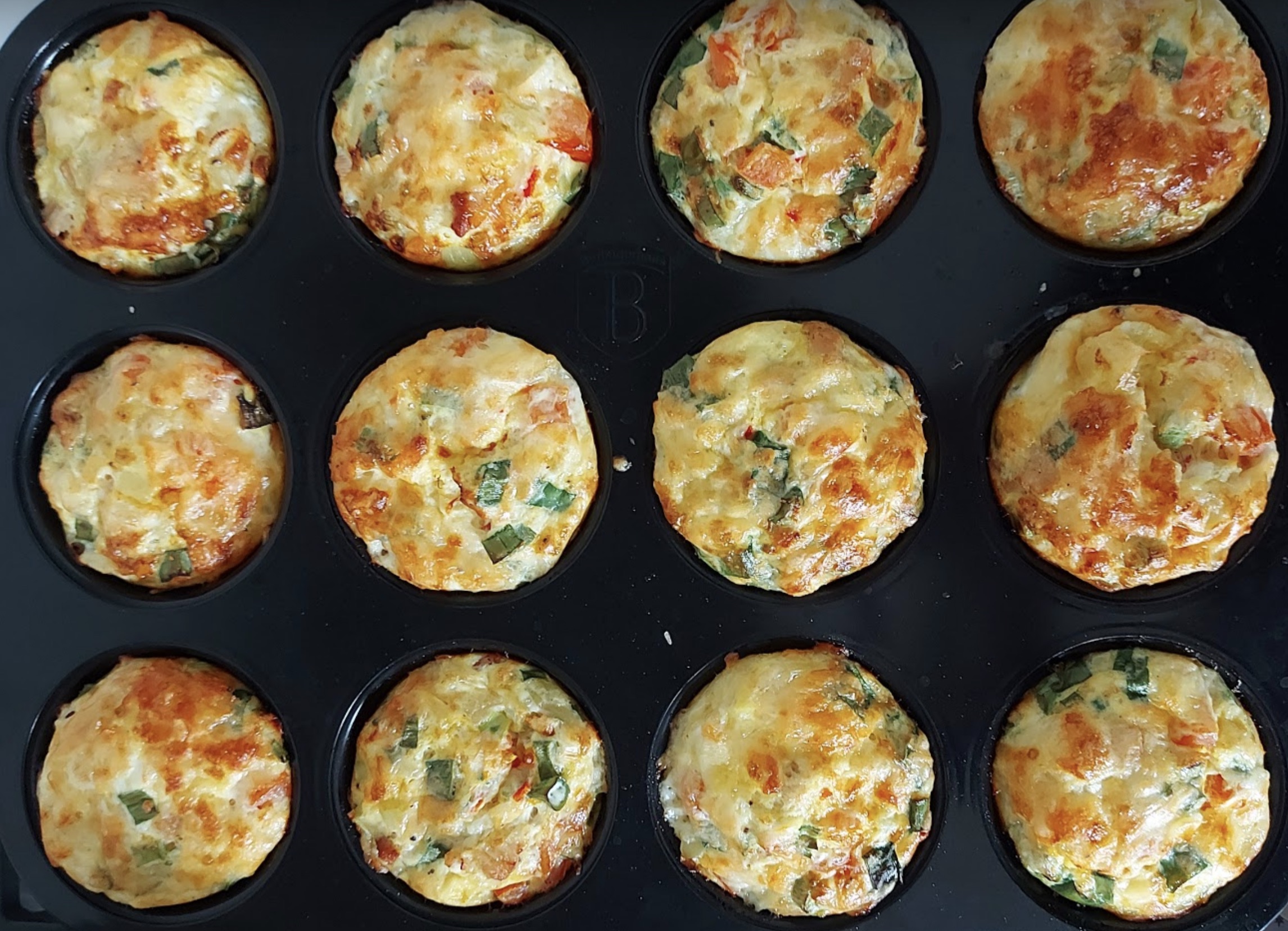 Pe lângă ouă și legume, am pus în aceste mini-omlete și niște resturi de pui călit rămase de la pastele de mai sus. S-au făcut simplu și s-au mâncat, sincer, mult mai bine decât o omletă clasică. Probabil datorită formei surpriză.