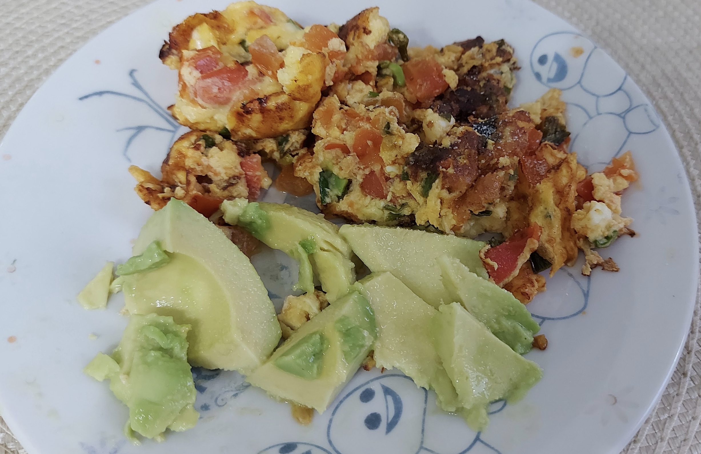 Omletă rapidă, cu ceapă verde, roșii și telemea. De fapt, cred că ar fi mai corect să-i spun scrob, având în vedere că s-a fărâmițat prin tigaie și a ajuns așa de rănită în farfurie 🙂