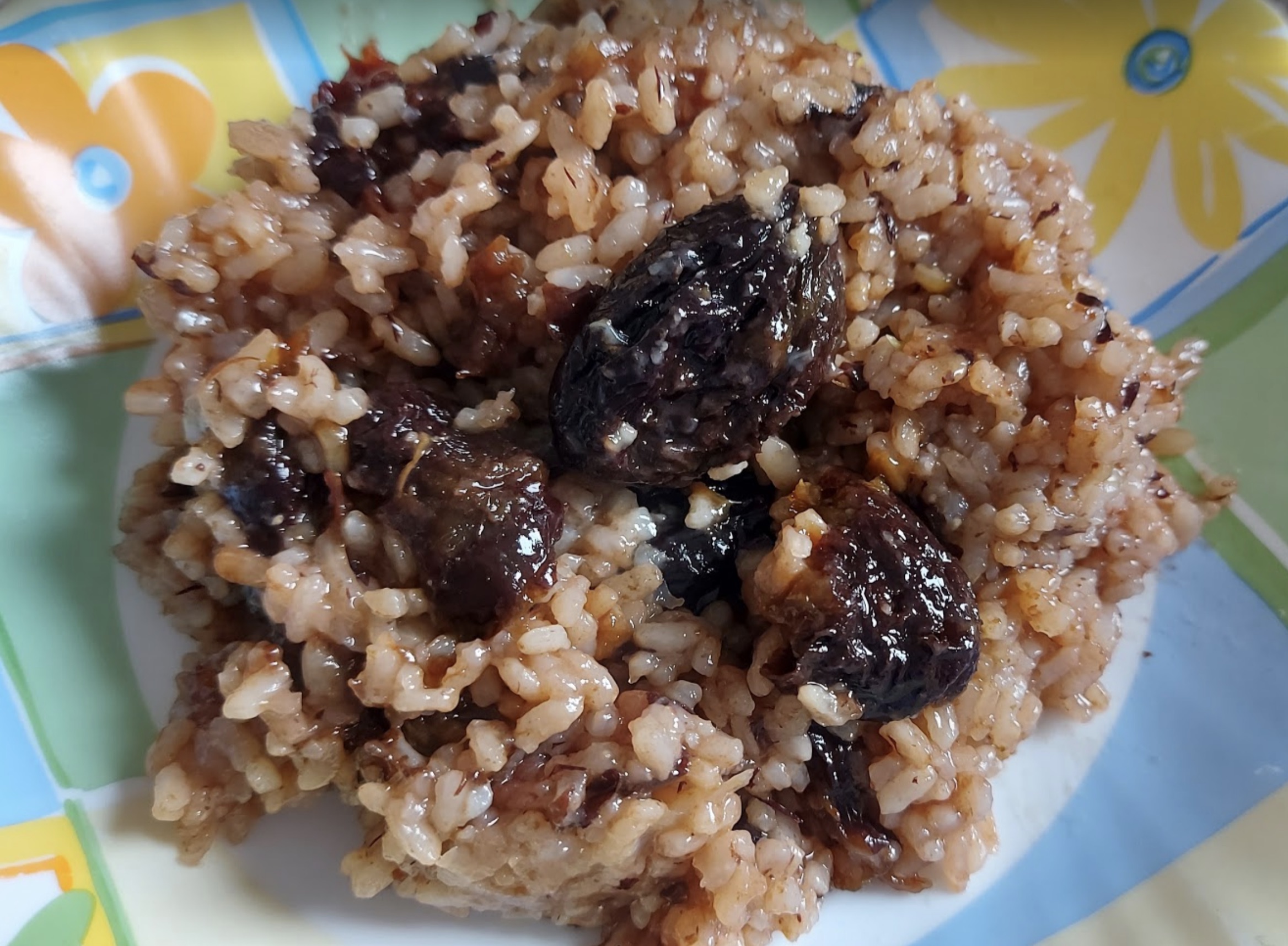 Rețeta e super simplă: se călește niște ceapă, se adaugă și orezul și se lasă un pic la călit, apoi se completează cu apă și prune și se lasă la fiert. Atât. Evident, se pune și sare, dar în rest nu e nevoie de alte condimente pentru că dulceața prunelor e vedeta din farfurie.