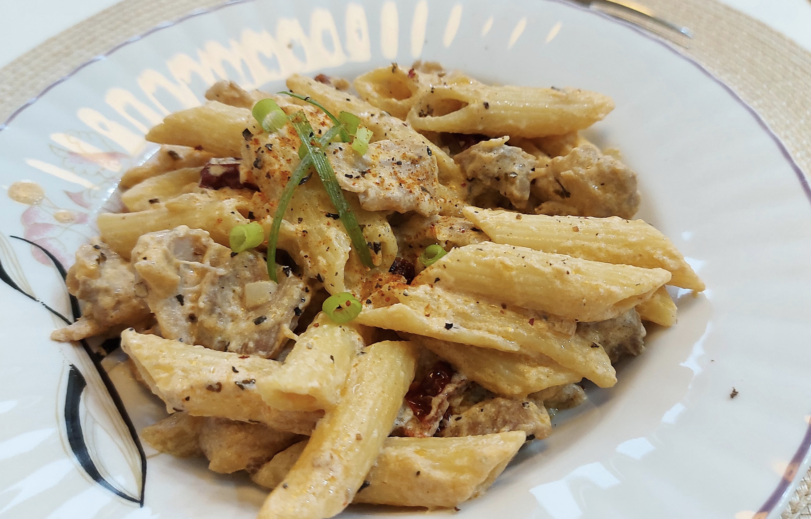 O improvizație rapidă pentru o seară fără inspirație. Penne, puțin piept de pui învârtit prin tigaie, ceapă verde și smântână.