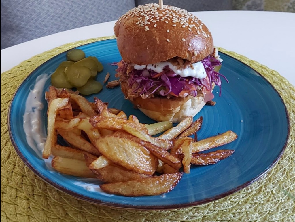 Burgerul de săptămâna asta n-a prins poză, a dispărut rapid, așa că am găsit o poză de tura trecută. Ce e diferit e că n-am avut cartofi prăjiți, iar peste porc am pus niște varză dulce adunată din oala de varză de care scriam mai sus și sos brun cu fructe din prun, între niște chifle pufoase, perpelite un pic pe grill cât să aibă și gust de pâine prăjită. Un deliciu.