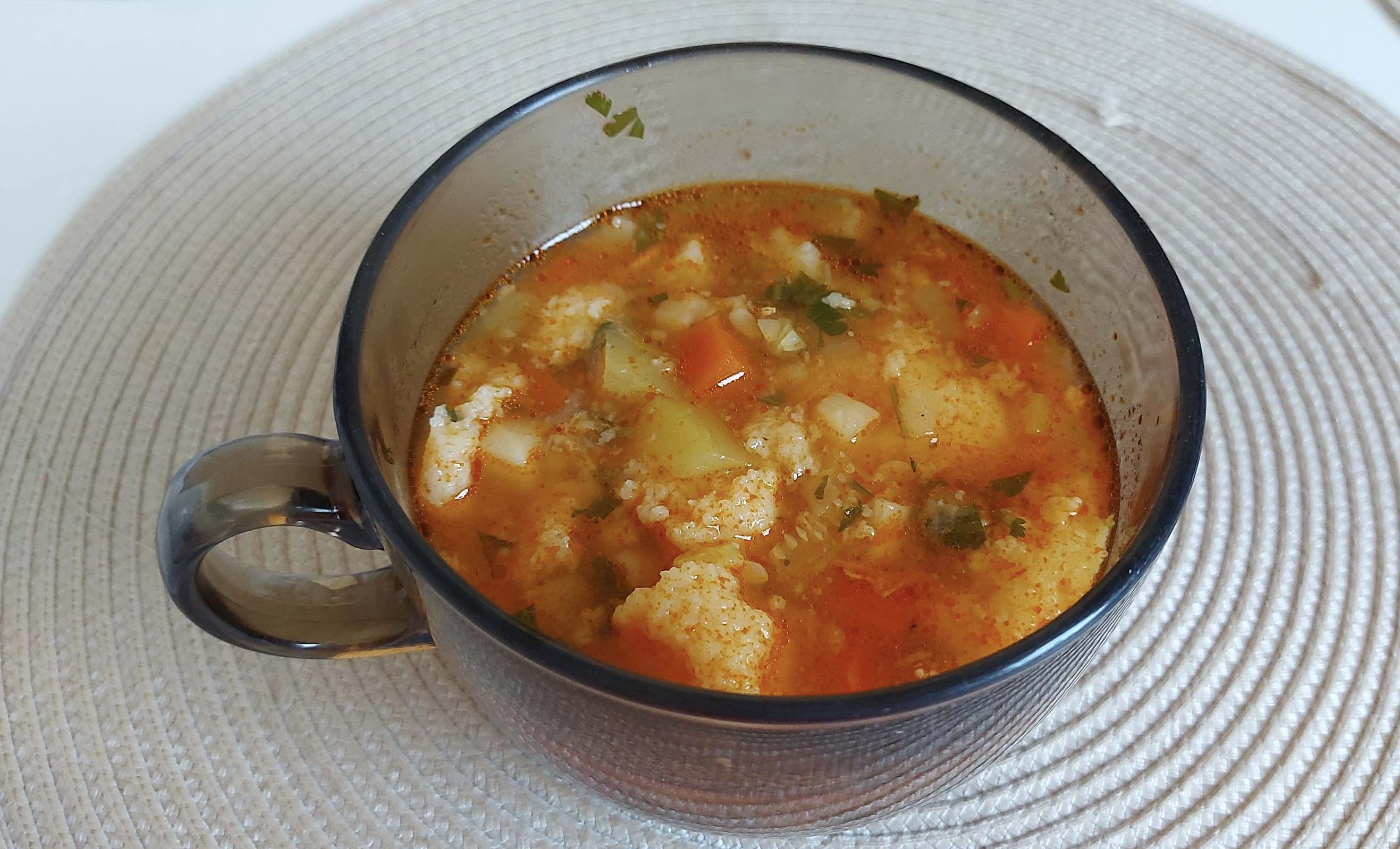 Săptămâna trecută rămăsesem restantă la capitolul supe, așa că acum m-am revanșat cu ceva rapid. Niște carcase de găină de țară, de prin congelator, legume, suc de roșii și găluște pufoase de griș.
