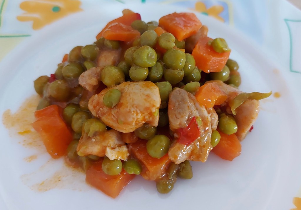 Rețeta asta e de fiecare dată pe placul întregii familii. Ceapă, morcov dulce, mazăre și suc de roșii, alături de pulpe de pui sau piept de curcan, tăiat în bucățele mici și rumenit întâi separat. Mai facem.