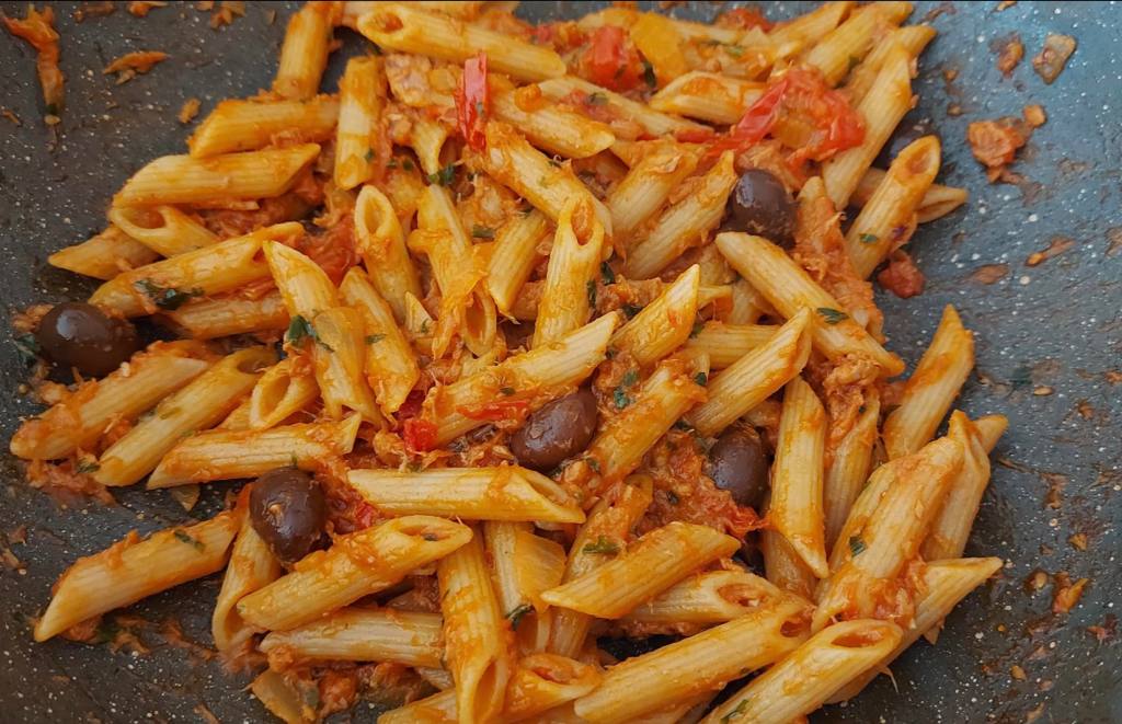 Rețeta clasică de paste: ceapă călită, câteva roșii cherry, o conservă de ton, puțin suc de roșii homemade și paste, de data asta integrale. E o masă nu doar gustoasă, ci și foarte rapidă.
