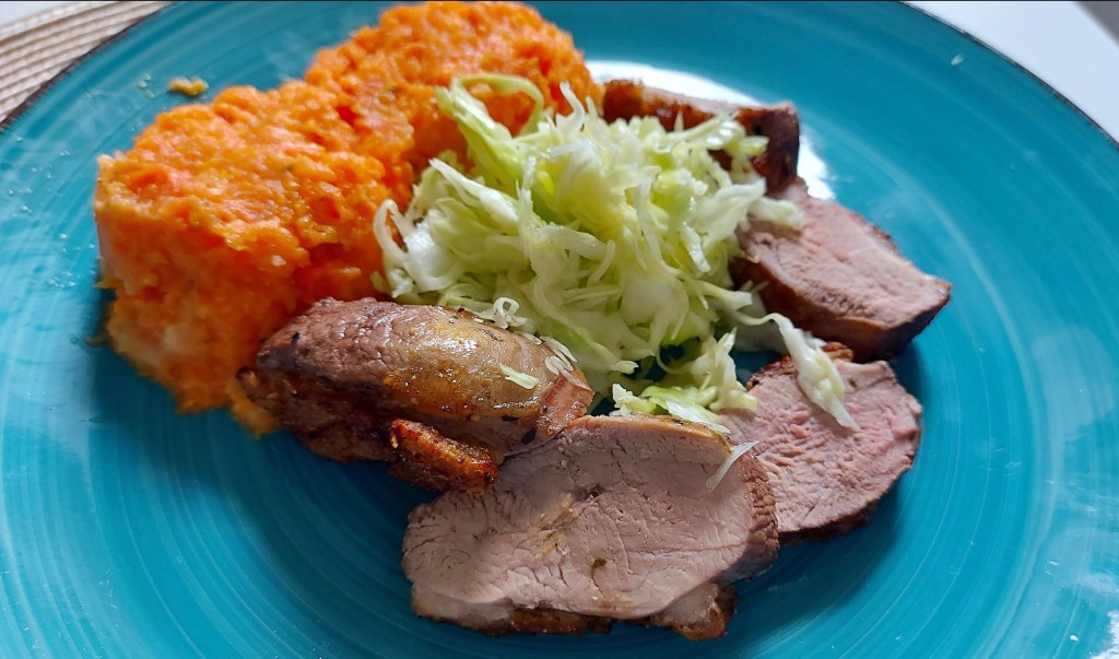 Pieptul de rață e gătit puțin pe tigaie, cam 7-8 minute pe fiecare parte, apoi băgat pentru încă 10 minute la cuptor.