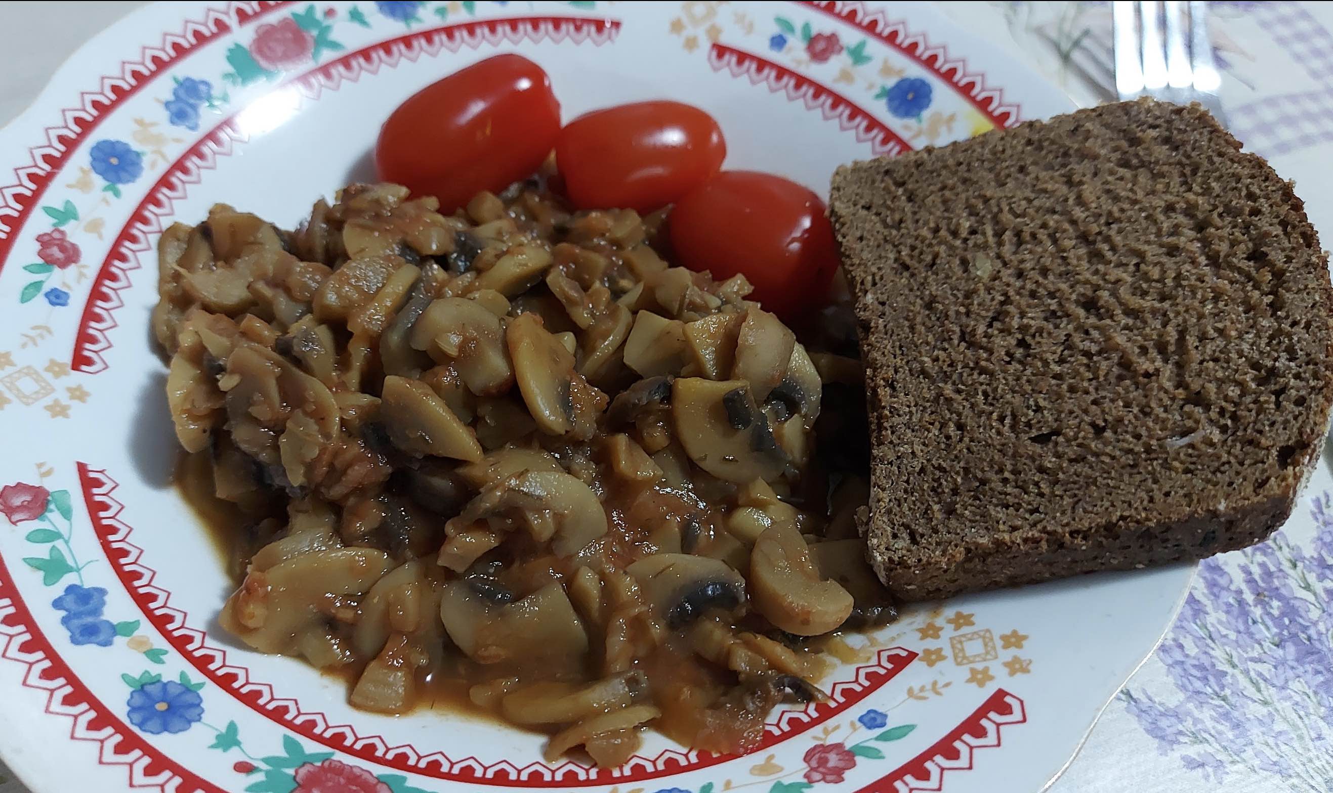 Ceapă, suc de roșii și ciuperci – ingredientele principale ale unei cine ușoare sau al unei garnituri pentru prânz. Sunt gustoase și se completează bine cu niște roșioare cherry și o felie de pâine neagră.