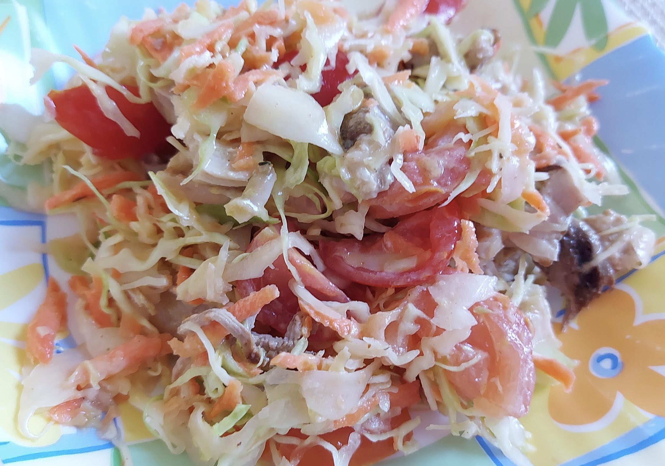 Din câteva bucăți de friptură de pui rămase nemâncate am încropit o salată ușoară, cu varză, morcov, roșii și dressing de iaurt.