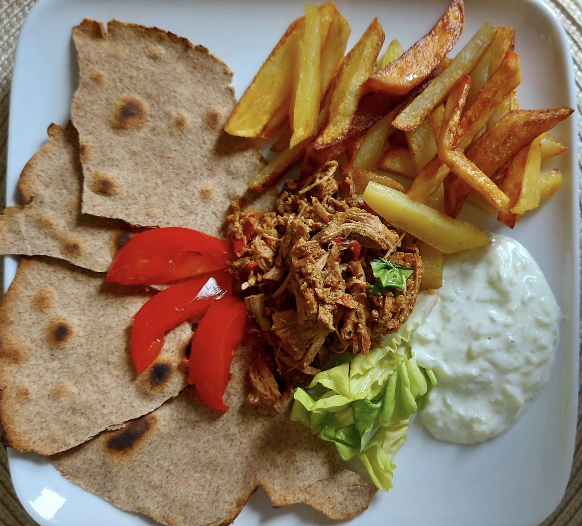 Shaorma la farfurie, cu pulled pork și tzatziki