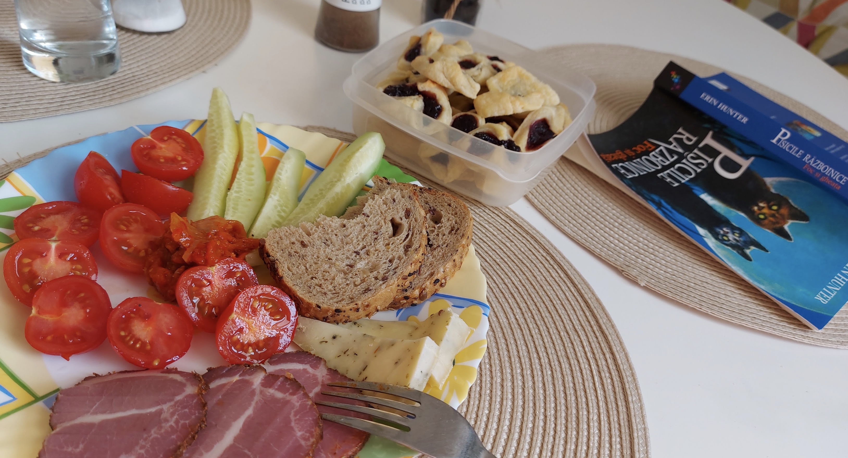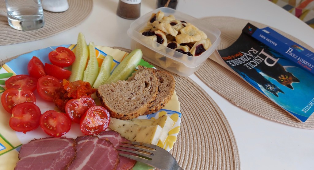 O masă cu de toate: legume, ruladă de cașcaval, pastramă afumată, pentru adulți. Pentru copil – fursecurile poloneze, că deh. Și pisicile războinice, de ceva timp sunt nelipsite de la mesele noastre. Dar cărțile sunt oricând prezențe agreate, telefoanele nu.