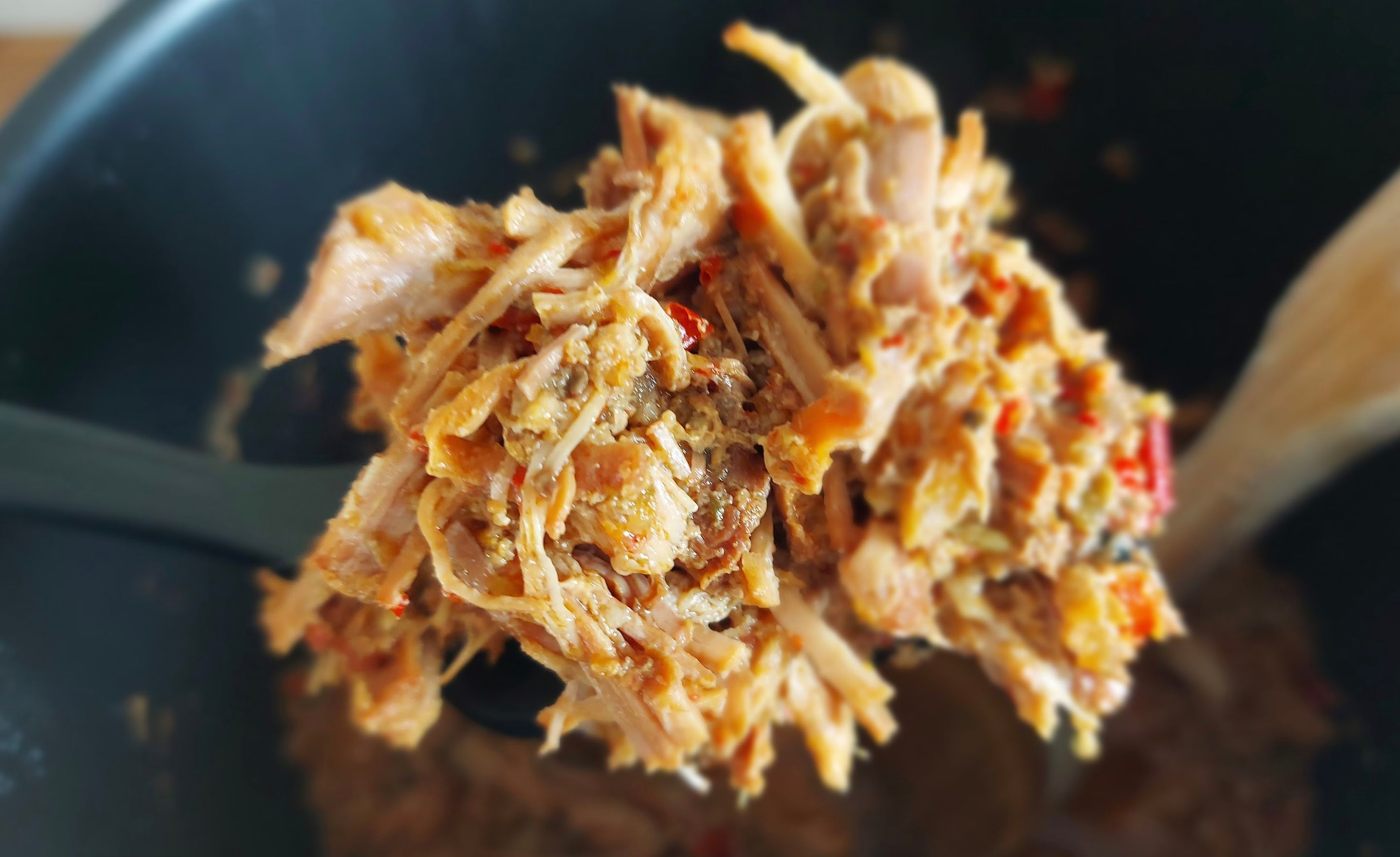 Pentru weekend am avut în plan o lucrare mai serioasă. Am lăsat de vineri seara la crock pot, pe programul de gătire lentă (10 ore) un mușchi de porc, înecat în condimente și sos de roșii. L-am găsit sămbătă dimineața așa: