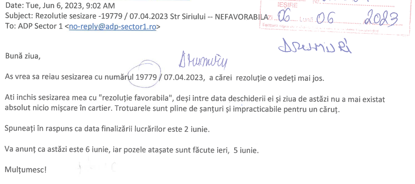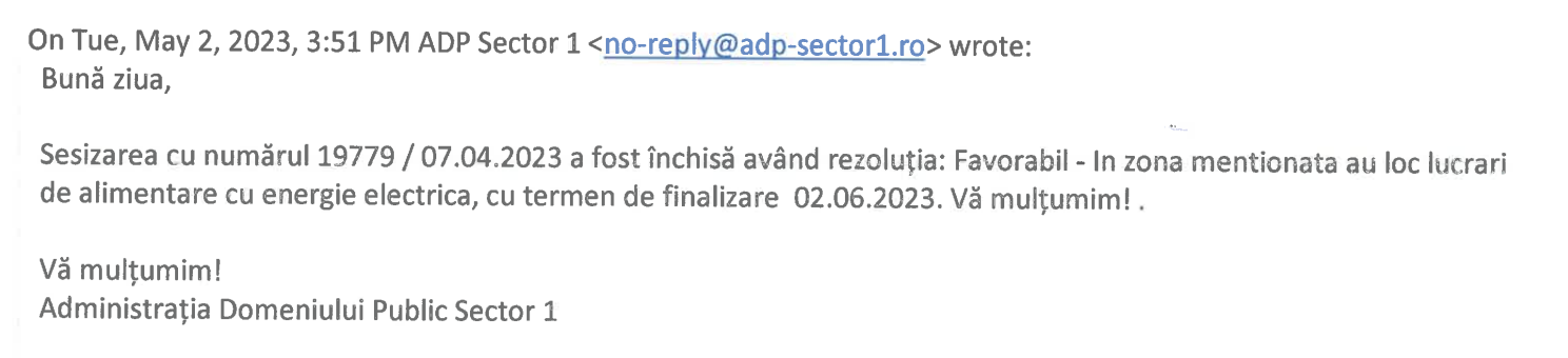 La aproape o lună de la transmiterea sesizării, timp în care pe teren nu se mișcase nimic, ADP îmi răspunde: sesizarea mea a fost închisă cu rezoluția favorabilă. Textul integral, mai jos: