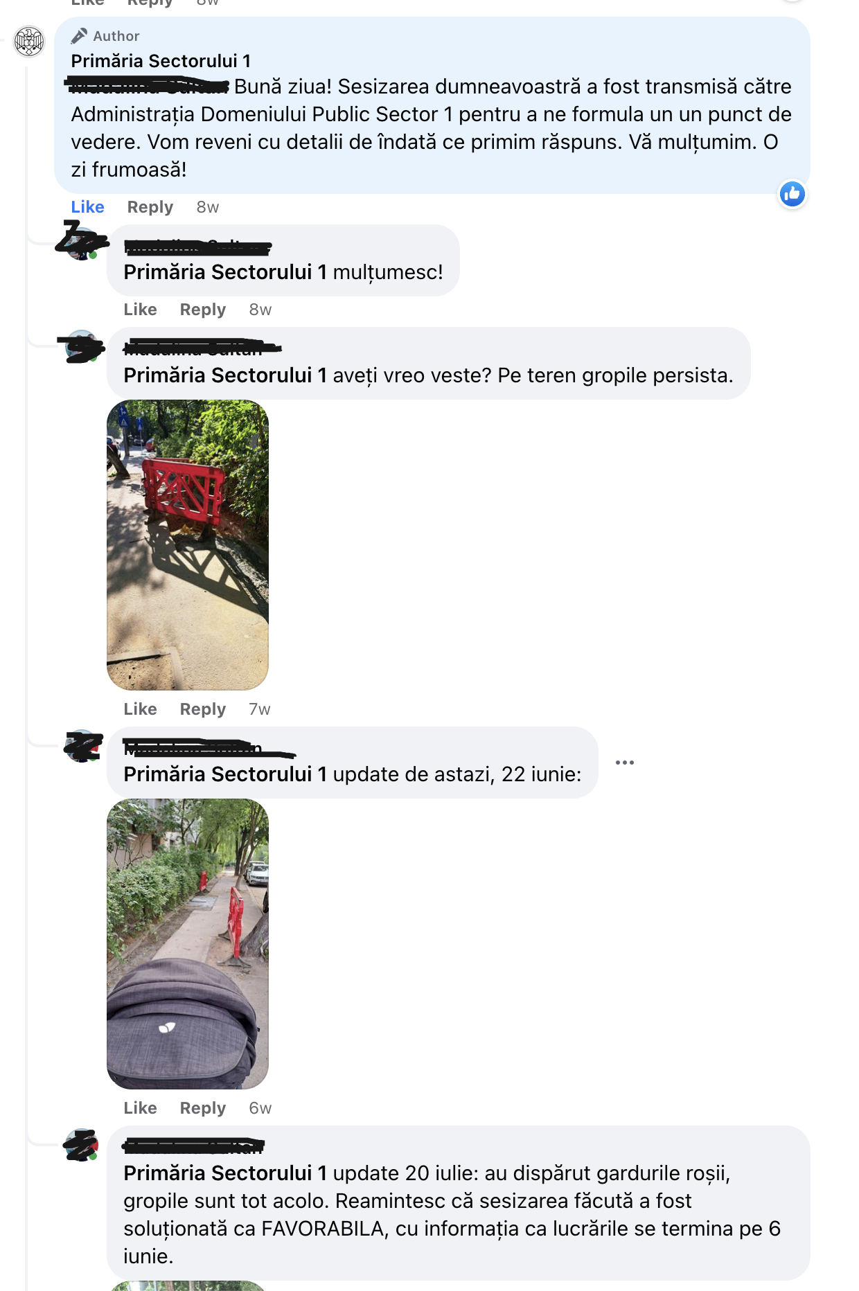 În speranța că Facebook-ul oferă mai multă vizibilitate, precum și o modalitate de „public shaming”, mi-am zis hai să fiu insistenta și acolo. Așa că am început să comentez la diverse postări ale primăriei, punând poze de pe stradă.
