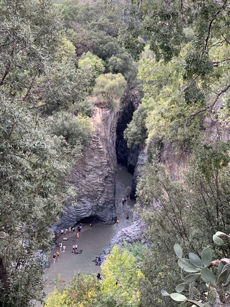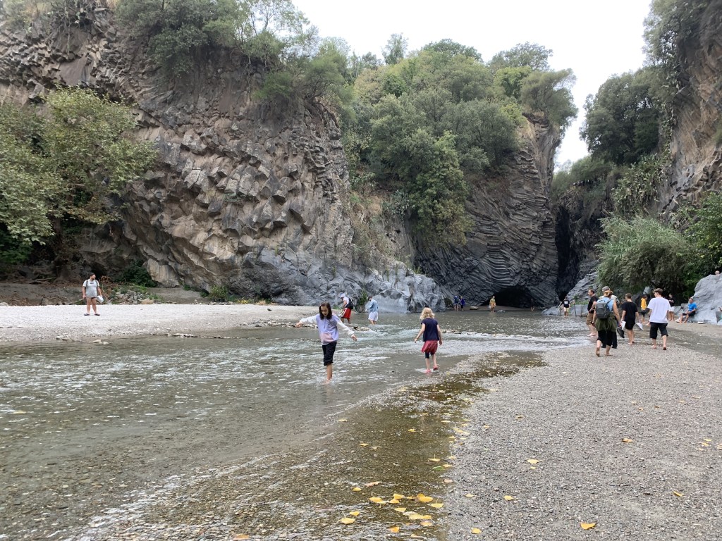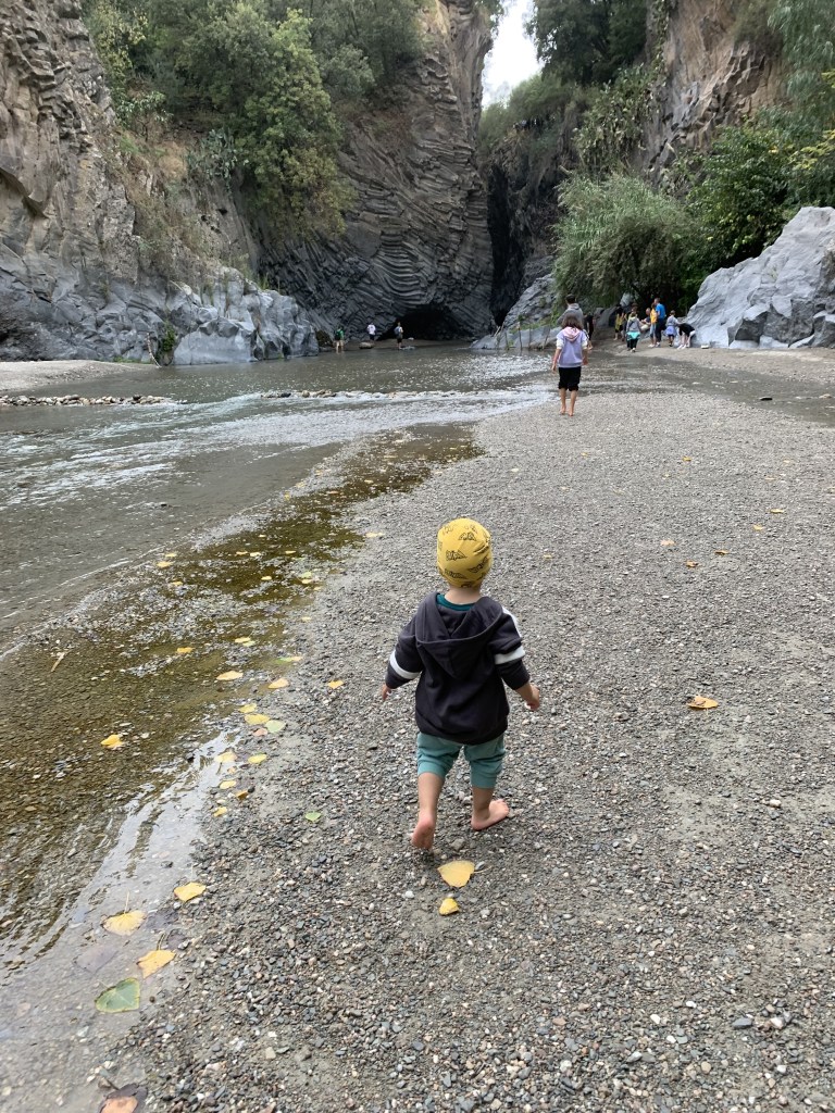 Am aflat despre Cheile Alcantara de pe un blog de călătorie și l-am simțit mai apropiat de genul de obiective turistice pe care îmi place să le văd într-o vacanță. Și așa a fost, păcat doar că am ajuns acolo printre picături de ploaie și cu un copil parțial răcit. Asta nu l-a împiedicat totuși să intre cu picioarele goale în apa de râu rece ca gheața.