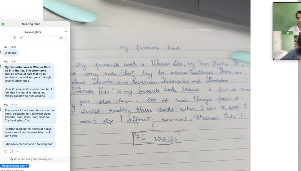 Am făcut o ultima „sedinta” de engleză cu Olivia în pregătirea examenului de mâine, de data aceasta pe Zoom. Ne și strica tehnologia, dar ne și ajută.