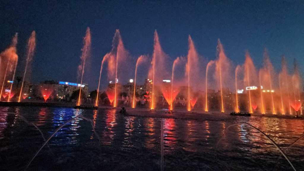 Am fost din nou la fântâni, dar de data aceasta în formula completă, și cu copiii, și le-a plăcut foarte mult amândurora. Olivia si-a exprimat satisfacția făcând poze, Vlăduț făcând „wow, wow, wow”. Și adevărul e că exclamațiile erau pe merit.