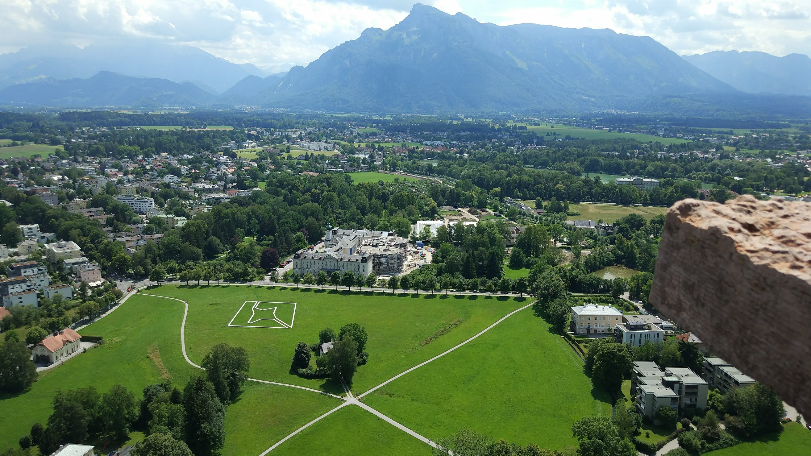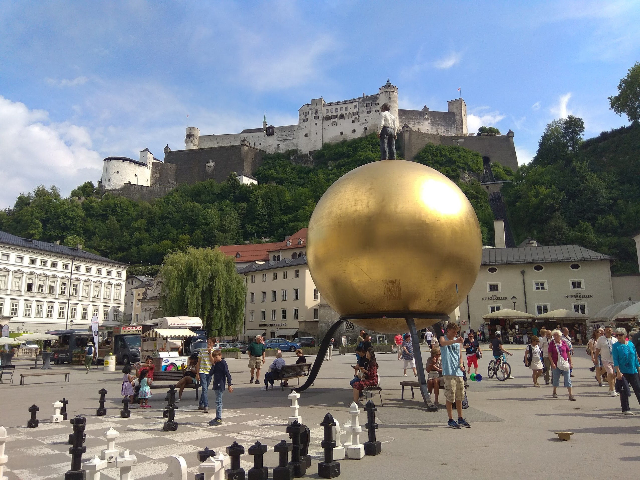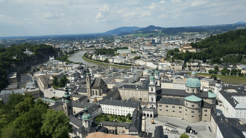 Ne-am plimbat puțin pe străzile orașului, apoi am urcat sus, spre celebra fortăreață ( Festung Hohensalzburg) cu funicularul. Îmi amintesc că priveliștea de acolo de sus a meritat, se vedea superb orașul dar si peisajul ce-l inconjura. De coborât am coborât însă pe jos, și, iulie fiind, era foarte cald, ne-a topit.