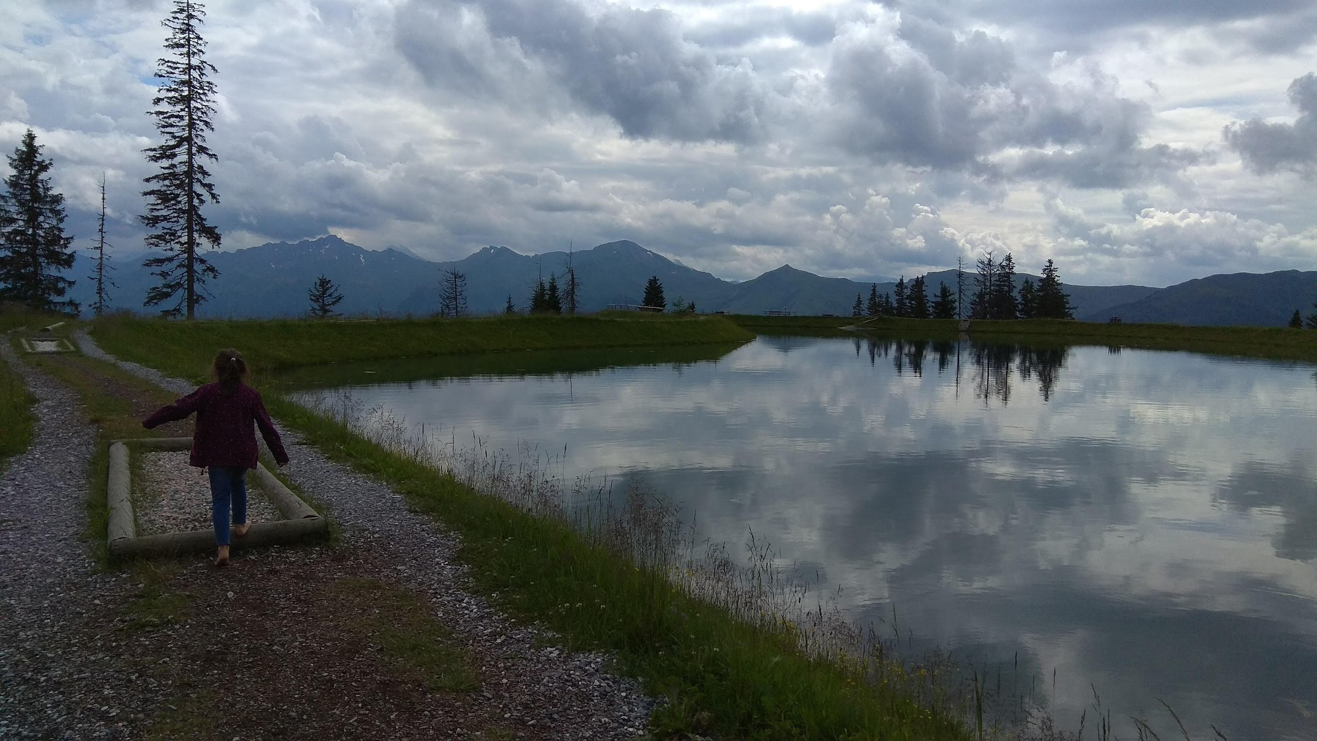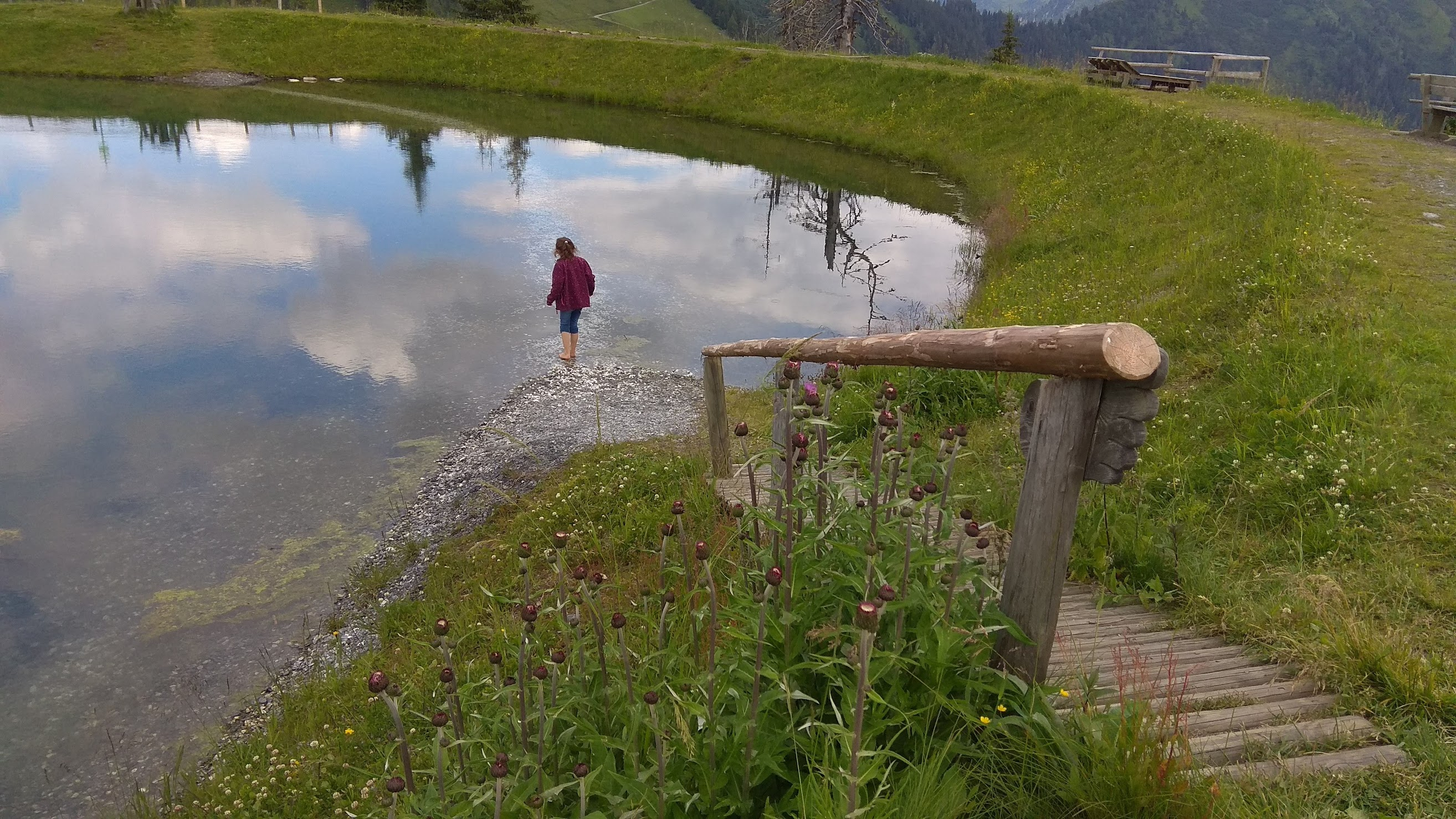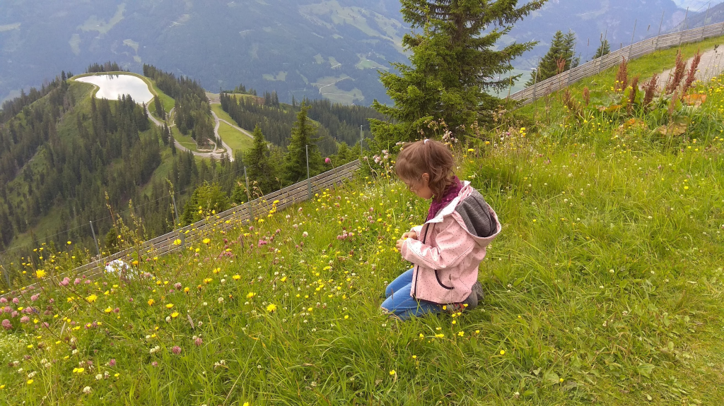 Primele 2 telecabine cu care mai urcasem în alte stațiuni aveau program pana la 6. Adică la 6 era ultima coborare de sus. Lacul Bad Hofgastein am urcat undeva pe la 3, și am ajuns sus intr-un peisaj de poveste. Un lac ca oglinda, poteca senzoriala în jurul lui, loc de joacă, iarba, flori, superb. A fost de departe locul meu preferat din tot ce am văzut în vacanța aceasta.