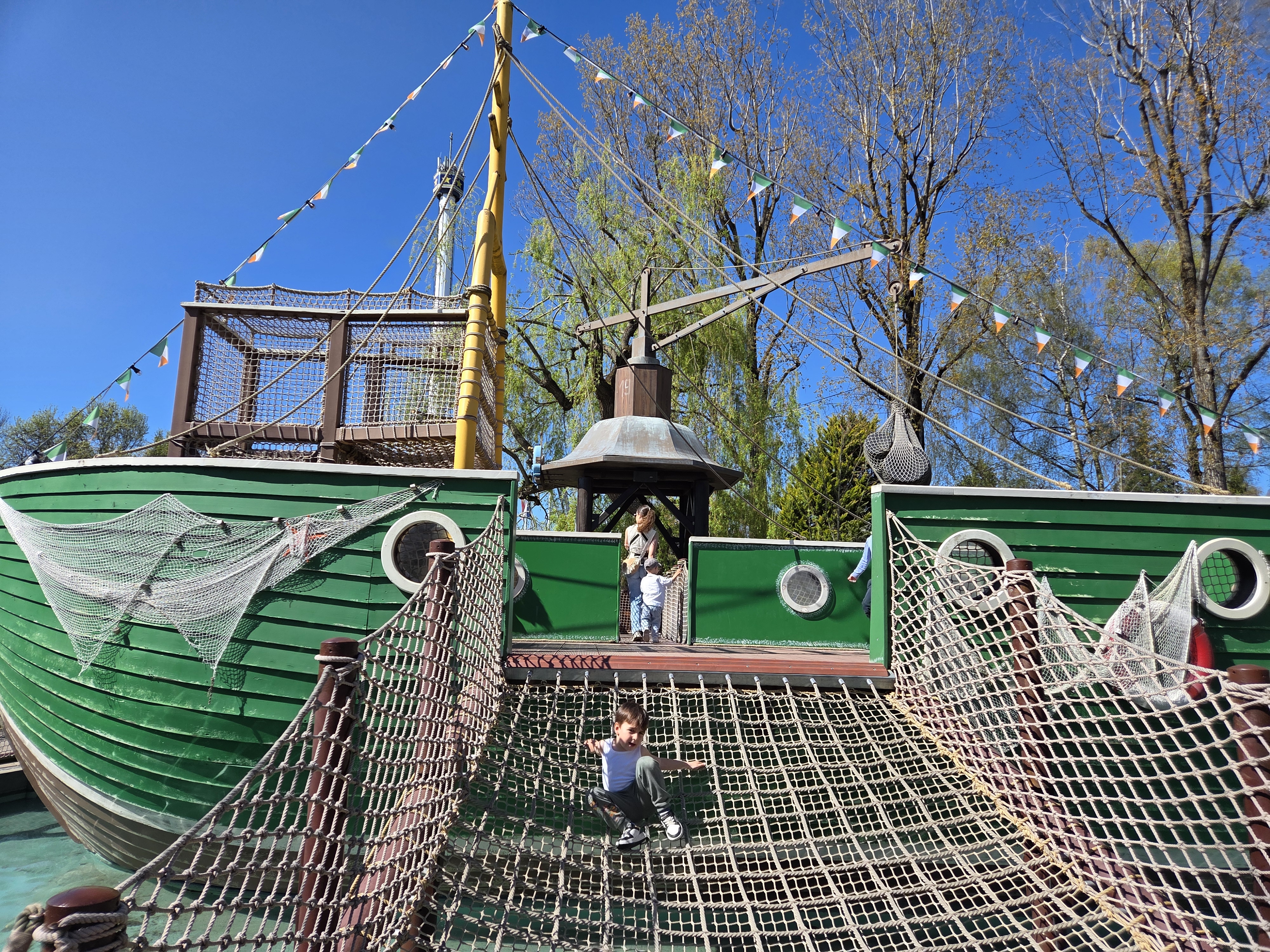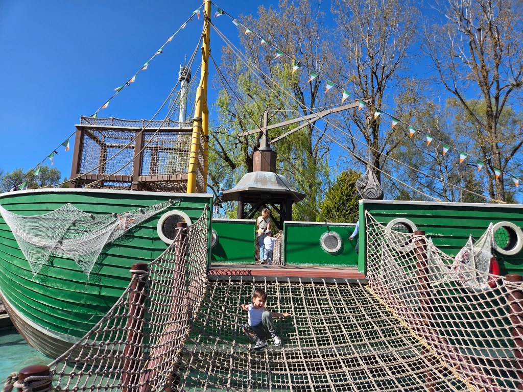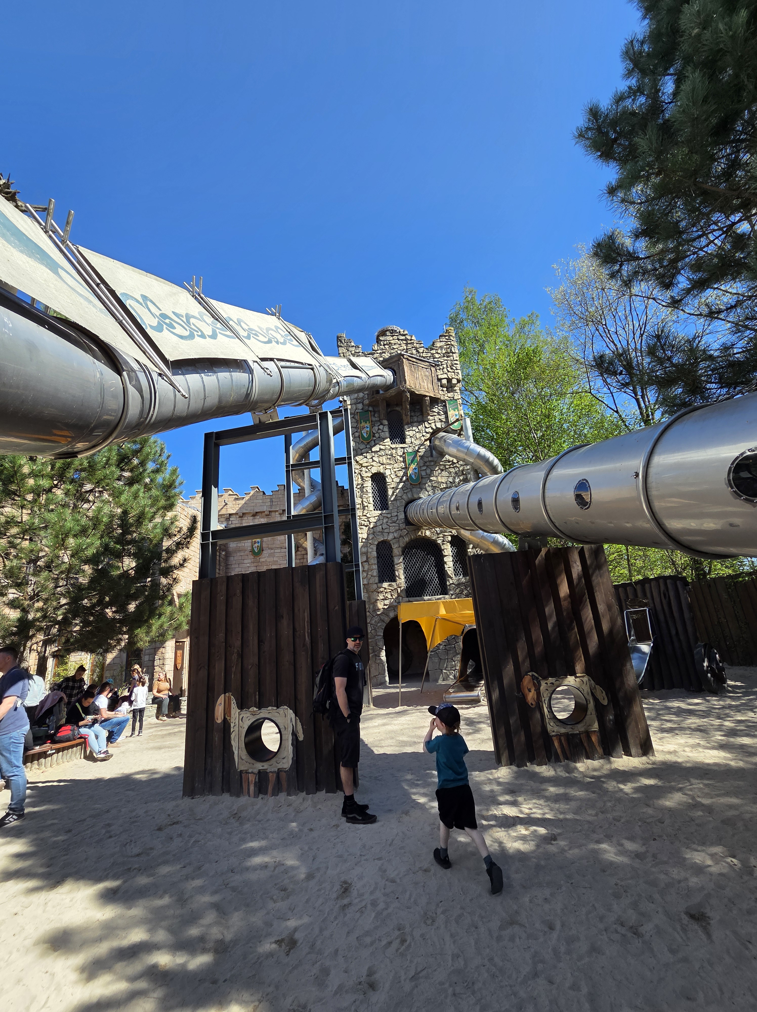 Vlad și D au continuat aventura testând o serie de zone destinate copiilor mai mici, fără însoțitor; n-am reținut toate numele dar ca și activități au fost cam așa: mașinuțe bușitoare (vreo 5-6 ture toată ziua), condus un canoe, apoi un tractor, apoi un tren, apoi un avion, loc de joacă cu apă, corabie de pirați, tobogane imense, pescuit rățuște. Succes maxim, nu l-am mai fi luat de acolo.