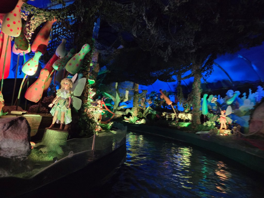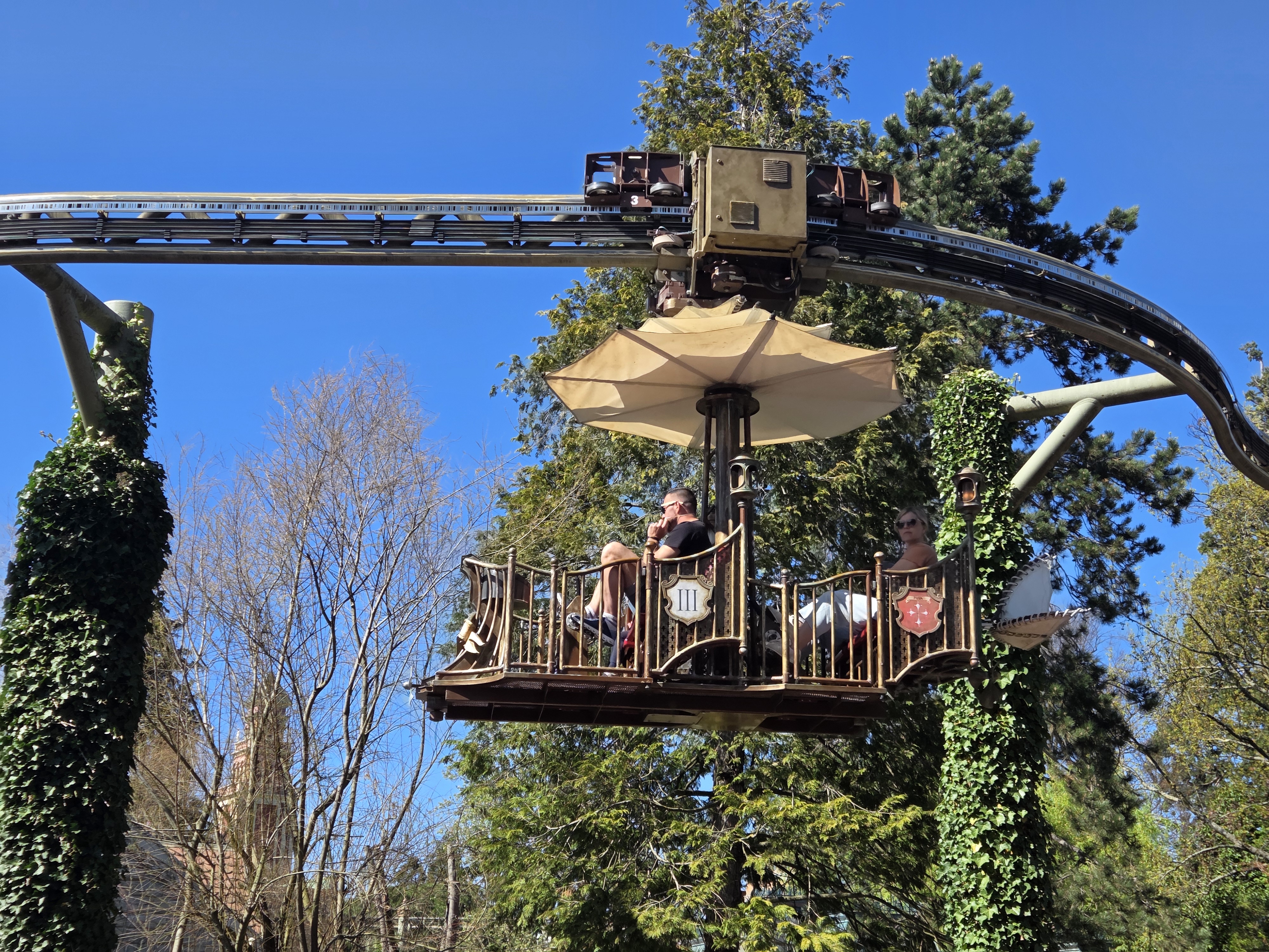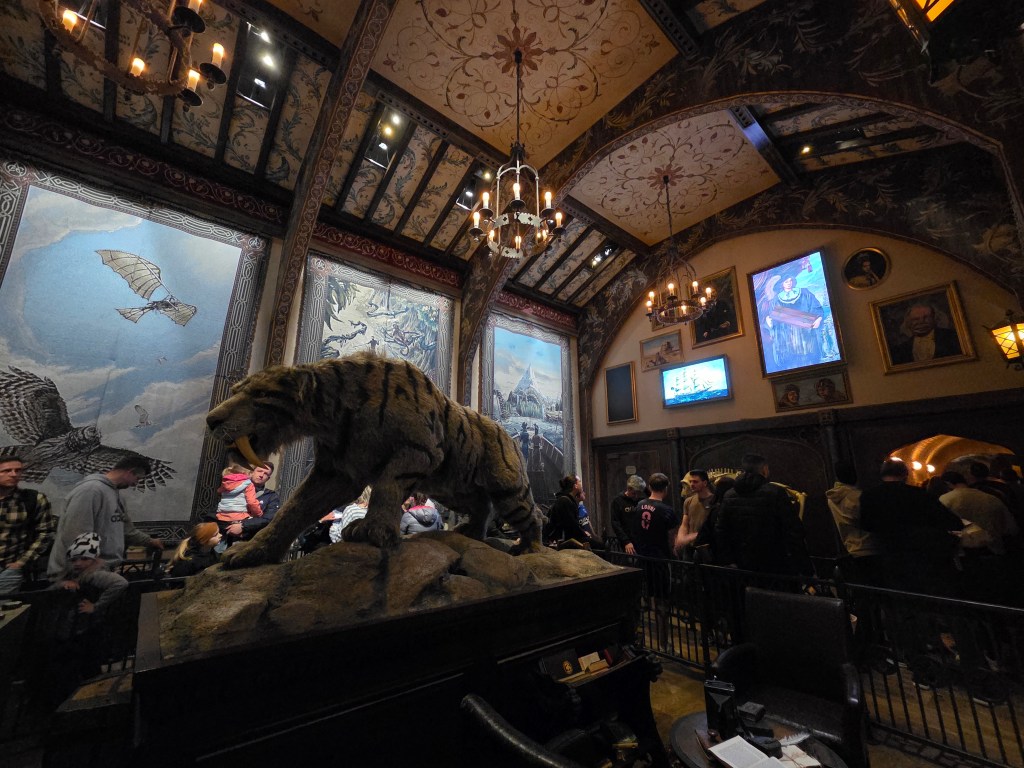 Prima noastră experiență (și cea mai tare), prima noastră greșeală: cum am intrat în parc, în zona Germania, am văzut o mică coadă la Voletarium, ne-am așezat la ea. Am văzut în aplicație waiting time 40 minute, am zis că n-are cum. N-am anticipat faptul că coada se întinde în interiorul clădirii, iar ceea ce se vede afară e doar 1% din ea. Din fericire, nu e chiar o coadă anostă, pentru că trece prin tot felul de camere fantastice, cu o grămadă de detalii, ai la ce să te uiți cât aștepți. Chiar și așa, cele 40 de minute au fost lungi și deja ne crizaserăm cu toții că a trecut deja o oră de când am parcat și încă n-am văzut nimic.