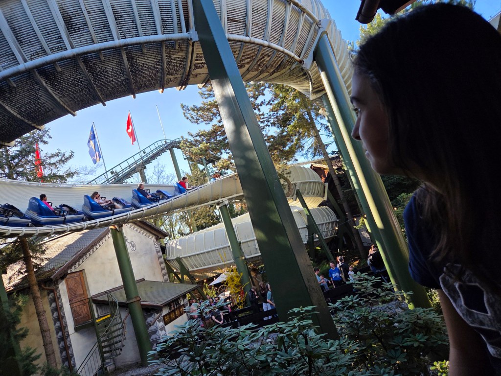 Al doilea roller coaster mai serios a fost Swiss Bob Run, unde ne-am așezat câte 2 într-un soi de bob, o mare parte din traseu s-a bazat pe roți, dar are și o porțiune unde tot ce te ține pe traseu e forța centrifugă. Nu te întoarce cu capul în jos, ci doar la 90 de grade, suficient de intens și asta.