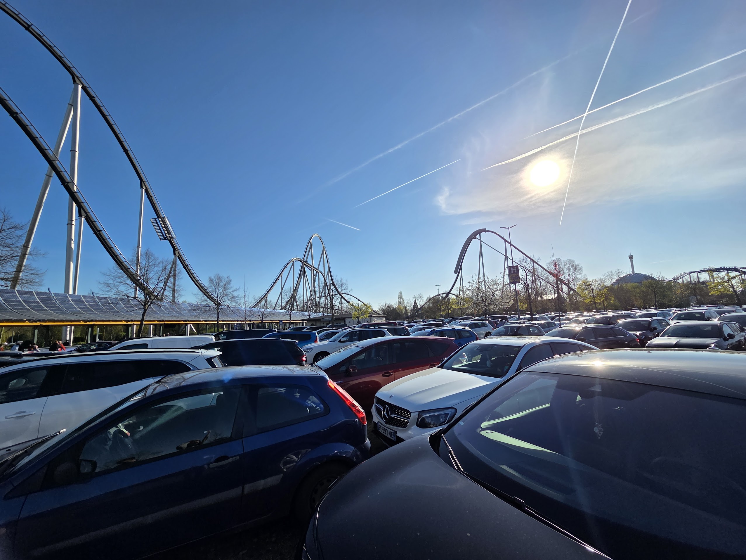 Am citit din mai multe surse că ar fi recomandat să ajungi acolo exact la deschidere (deci la 9a.m), pentru a profita de primele ore ale dimineții când aglomerația e minimă. (În paranteză fie spus, am verificat acum, se estimează că au fost cam 30.000 de oameni în Europa Park pe 7 aprilie, odată cu noi. Aglomerație medie.) Părerea mea este însă că toți vizitatorii din ziua respectivă au citit cam aceleași recomandări, căci la 9.10 când am pus noi roata în parcarea cea imensă… aș zice că era plină deja, cam pe jumătate. Și oamenii deja țipau pe deasupra noastră, rotiți cu capul în jos la viteze de zeci de km la oră, ceea ce mă face să cred că unii fuseseră încolonați la intrare încă de la 8am, cât să prindă primul bon de ordine la cele mai populare atracții. (Zic pe deasupra noastră pentru că chiar în drumul spre parcare, și din parcare, simți adrenalina locului, roller-coasterele gigant fiind cât se poate de vizibile și de … auzibile).